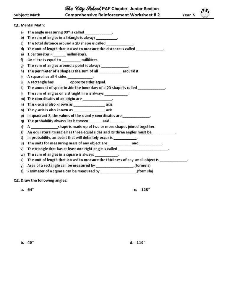 Math-comprehensive-worksheet-for-1st-term-class-7-ans-key2019.pdf View Homework Help - math-comprehensive-worksheet-for-1st-term-class-7-ans-key2019.pdf from PHARMACOGN 415 at DOW University of Health Sciences, Karachi. The City School PAF Chapter Comprehensive 5th Grade Math Worksheets PDF | Printable PDF Worksheets 5th Grade Math Worksheets PDF. A set of fun and engaging math worksheets for 5th grade students. Cazoom Math is a is a trusted provider of mathematics worksheets and provides a superb range of differentiated and colorful math worksheets for students in Grade 5 (age 11 - 12). Our grade 5 math worksheets are aligned to the common core state ...